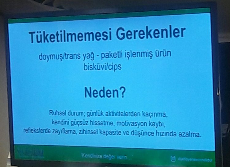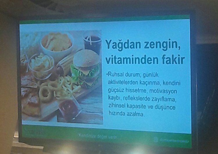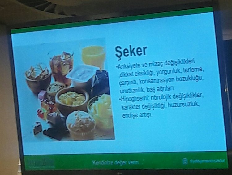 Bugün öğle arasında Beslenme ve Diyet Uzmanı Sevinç Akdur’un “Beslenmenin Psikolojiye Etkisi” konulu konuşmasını dinledik. Dün cipsi hayatımdan çıkarma kararı almışken, çoğu akşam kendimi halsiz hissederken ve insanların ruhsal olarak yaşadıkları sorunlar bu kadar çoğalmışken seminer iyi geldi.